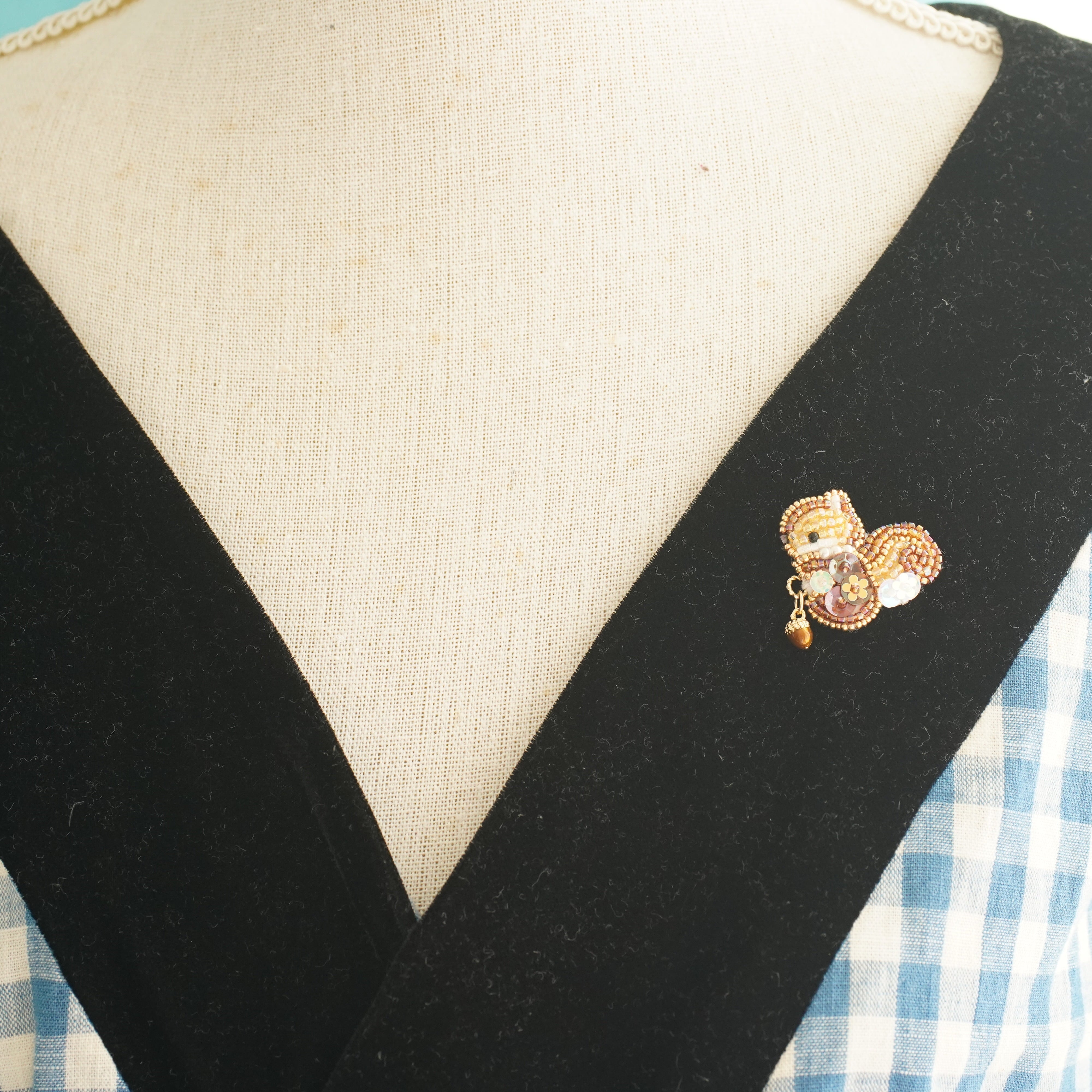 ゆれる小さなどんぐりが可愛いリスのビーズ刺繍です。