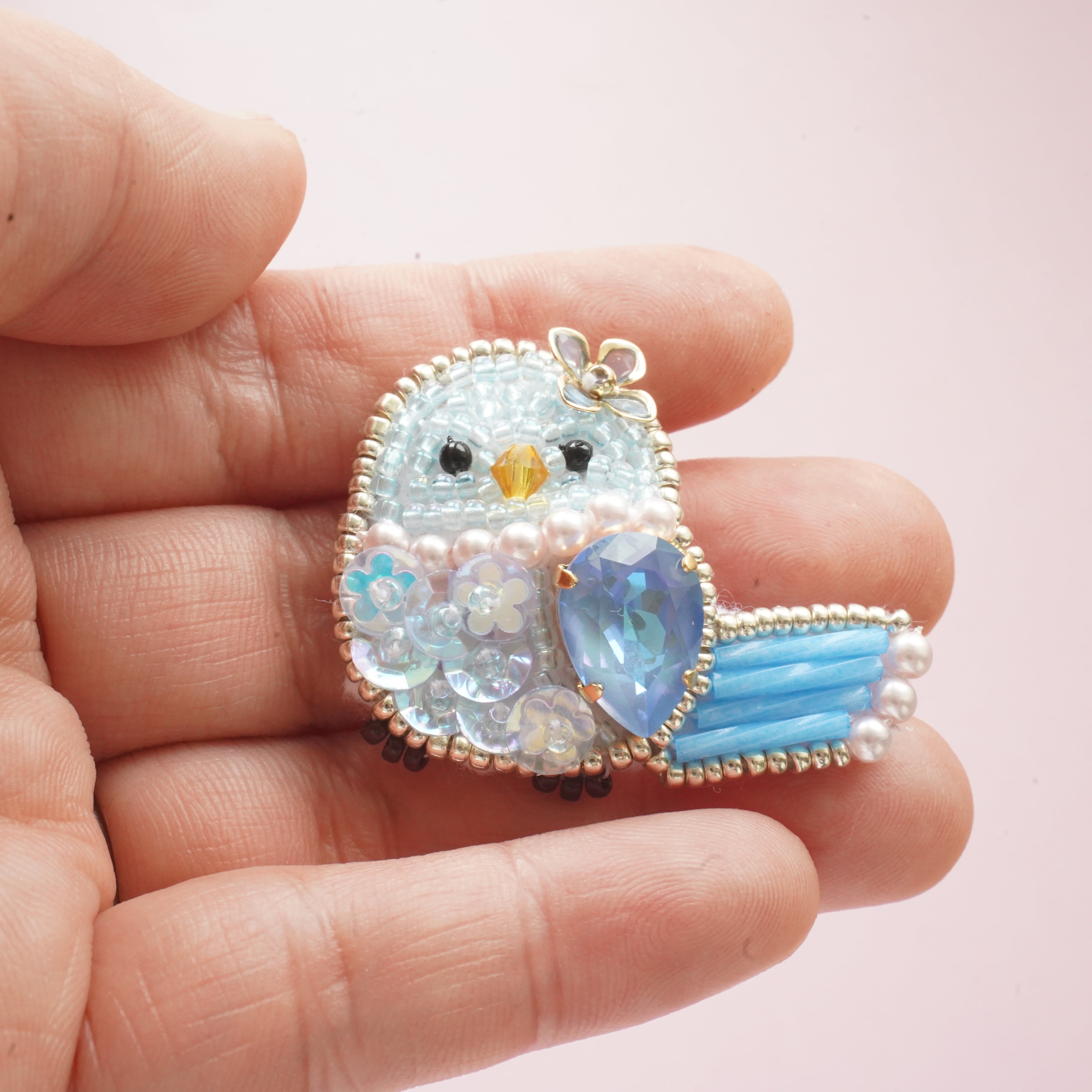 Bead embroidery of a bluebird of happiness.